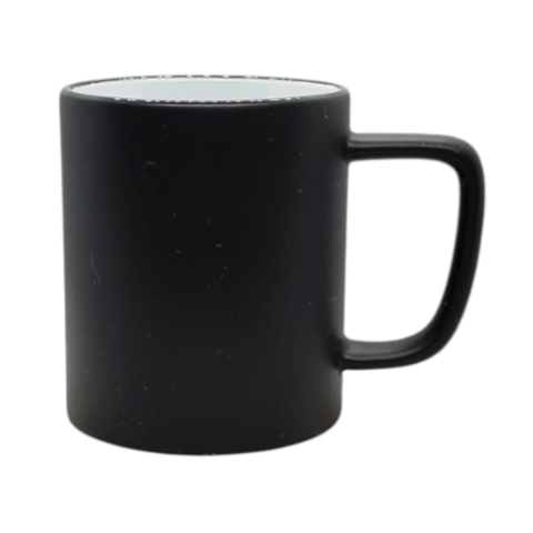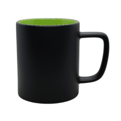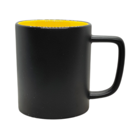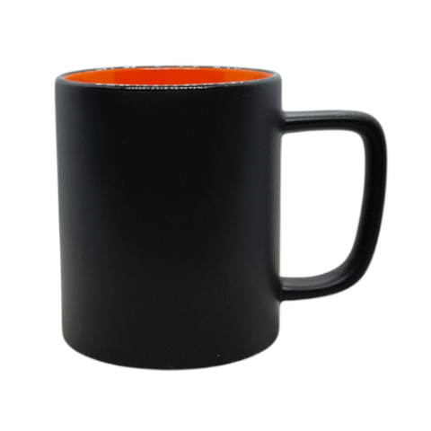 Elegancji kubek o klasycznym kształcie z ciekawym uchwytem dostępny w wersji matowej czarnej z kolorowymi błyszczącymi wnętrzami.